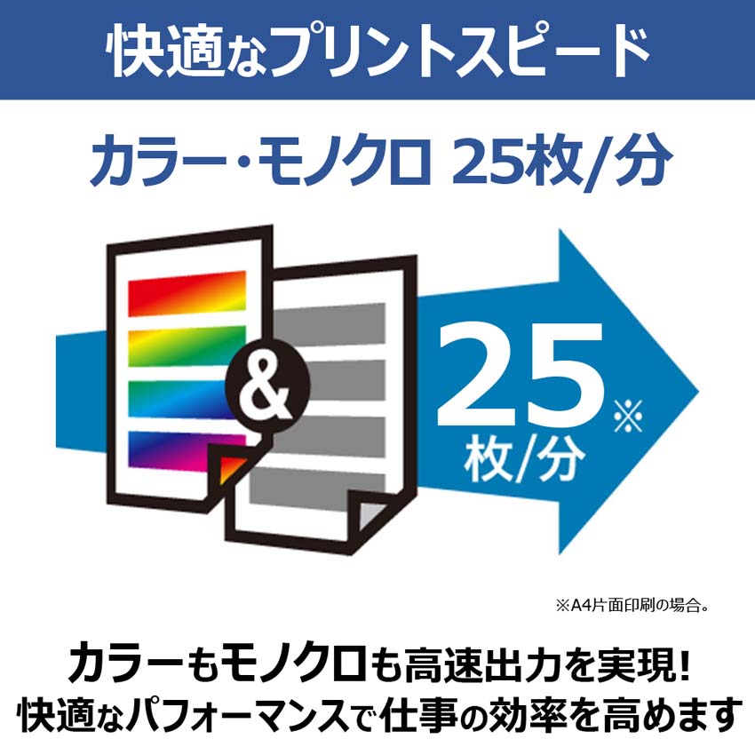 連続印刷25枚/分の快適印刷に優れたセキュリティ機能。両面印刷や無線LAN、モバイル連携を備えたスマートモデル