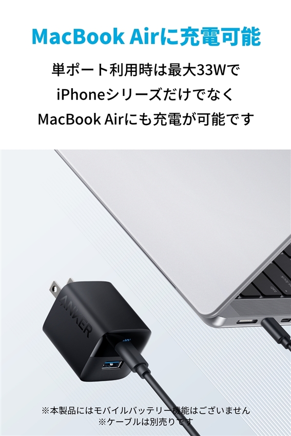 USB Type-CポートはUSB PD(USB Power Delivery)に対応し、単ポート利用時は最大33Wの出力でiPhoneやMacBook Airに急速充電が可能です (本製品にはモバイルバッテリー機能はございません) 。
