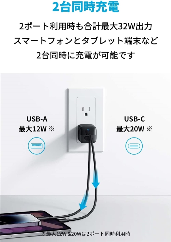 USB Type-AポートとUSB Type-Cポートを搭載。2ポート利用時でもUSB Type-Aポートから12W、USB Type-Cポートから20Wの出力で、お使いのスマートフォンとタブレット端末などを同時に充電することが可能です。
