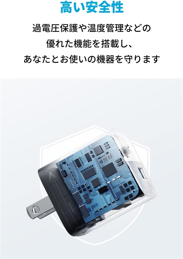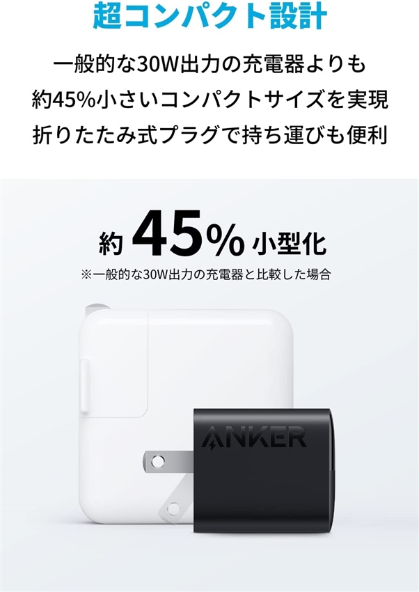 一般的な30W出力以上の充電器に比べ、約45%小さなコンパクトサイズを実現。折りたたみ式プラグを採用し、どこにでも気軽に持ち運ぶことができます (※ケーブルは別売りです) 。