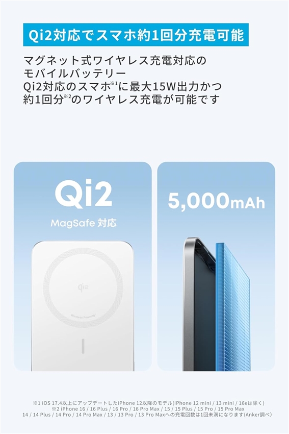 ・本製品はQi2対応のスマートフォン等のデバイスとマグネット式ワイヤレス充電対応ケースにのみ対応しています。最大約15Wの出力でのマグネット式ワイヤレス充電は、iOS 17.4以上にアップデートしたiPhone 12以降のモデルにのみ可能です。 (iPhone 12 mini / 13 mini / 16eは除く)