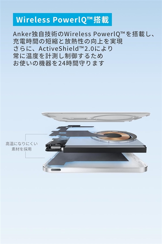 Anker社独自技術のWireless PowerlQ™を搭載し、充電時間の短縮と放熱性の向上を実現。さらに、ActiveShield™ 2.0により、常に温度を計測し制御するため、お使いの機器を24時間守ります。