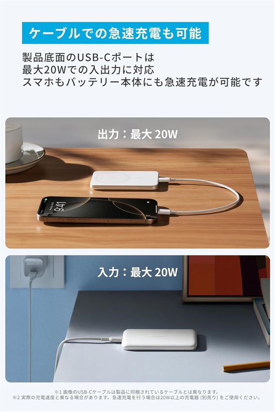 ・本製品には充電器が付属しておりません。20Wの入力に対応するには20W以上の出力が可能な充電器 (別売り)をご使用ください。