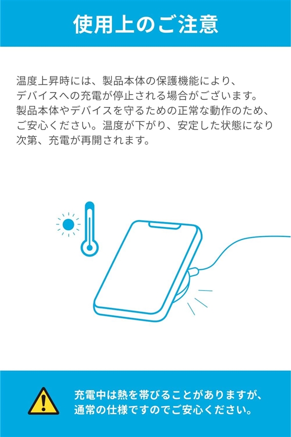 ・充電中は熱を帯びることがありますが、通常の仕様です。発熱防止のため、高温時は出力が自動調整されます。iOS 18では「設定」>「バッテリー」に「低速充電」というメッセージが表示されますが、安全に充電できますのでご安心ください。
