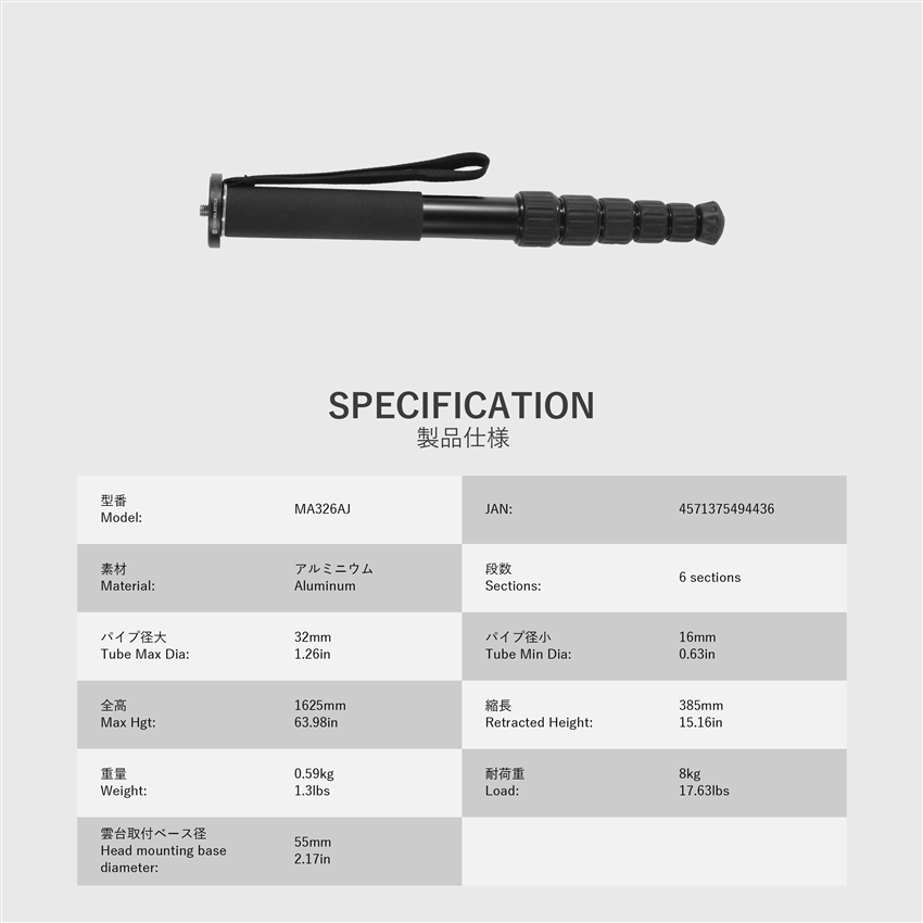 「MA326AJ アルミ6段一脚」は、写真撮影やビデオ制作におすすめのアイテムです。