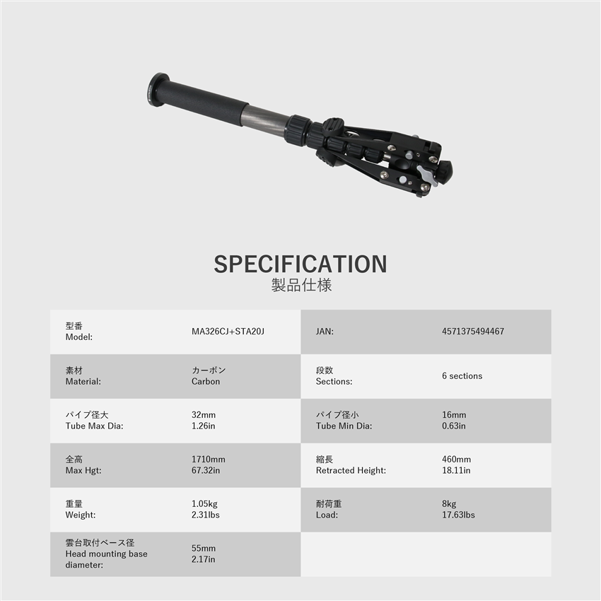 トキワスタイル カーボン6段一脚マルチスタンドセット MA326CJ+STA20J ■納期約2〜3週間