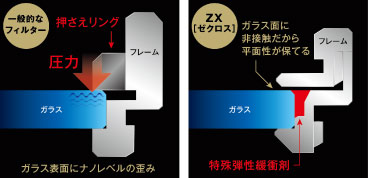 従来のPLフィルターはフィルター枠でガラス面を押さえて固定するため極わずかな歪みがガラス面に生じてしまいます。ZX C-PLは特殊な緩衝材でガラスを保持しているため、ガラスの平面性を保ちます。レンズの解像力をそのままにPL効果を発揮する高画質のPLフィルターです。